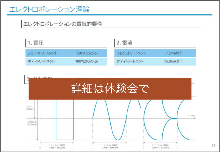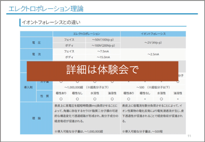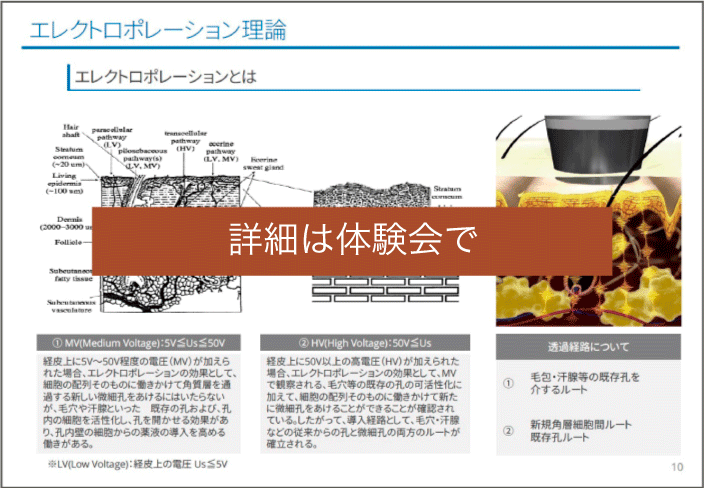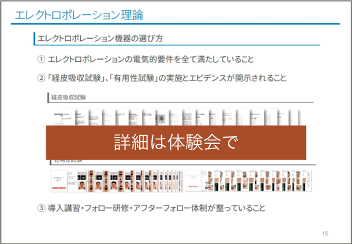 エステティック市場では、多くの美容機器製造メーカーが、エレクトロポレーション理論そのものについて、知見不足のため理論を理解できていないことから、高分子成分の経皮吸収作用が確認できない機器が、残念ながらエステ市場に多く存在していることが知られています。本体験会では、正しいエレクトロポレーション理論と安全な機器の選び方を、解かりやすく解説いたします。